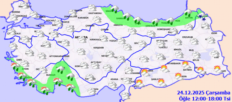 ANKARA (İGFA) – Meteoroloji Genel Müdürlüğü, 24 Aralık Çarşamba gününe ilişkin hava tahmin raporunu yayımladı.