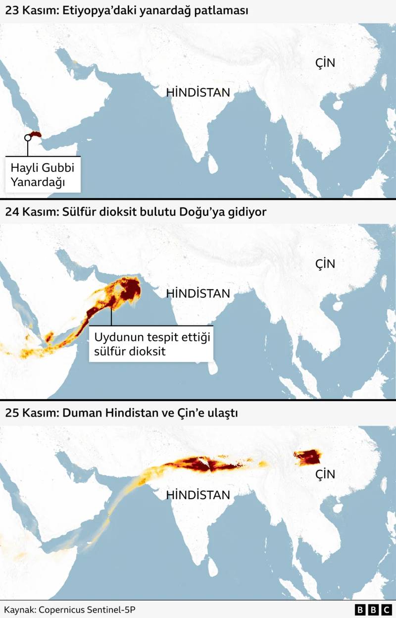 Etiyopya’daki Hayli Gubbi Yanardağı, 23 Kasım 2025 Pazar sabahı patlamadan önce 12 bin yıldır uyuyordu. Bin yıl boyunca hiç ses çıkmayan yanardağ, binlerce metreye yükselen kül bulutuyla atmosfere gaz ve küçük partiküller yolladı.